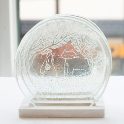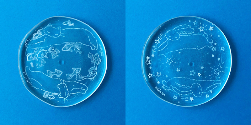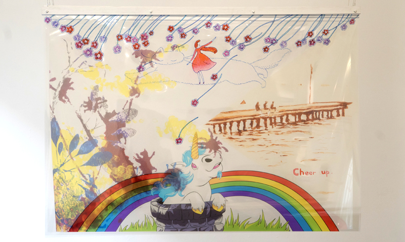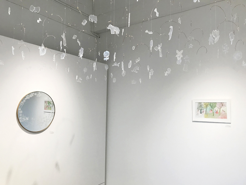 主に透明な素材であるガラスや鏡を支持体に、イラストレーション作品の展示。 今回の展示では自身の作品の展示と平行して、密にならない方法で 他の作家とのコラボレーションを試みました。 具体的には、フランス在住の友人達の作品画像を送ってもらい A0程度の大きさの透明フィルムに印刷、それらを重ねて1つの絵 (作品) として展示しました。 会期中にはリモートによるライブペイントによって 完成した小作品の展示もありました。 距離がある中でも活動出来る方法を模索しました。